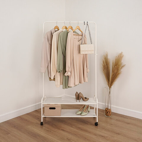 Многофункциональная мобильная вешалка для открытого хранения вещей дома, в офисе и зале магазина. Это не просто вешалка, это гардеробная система со штангой для плечиков, полкой для обуви и органайзеров, крючками для сумок, зонтов и других аксессуаров.