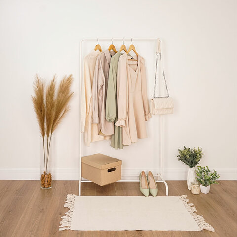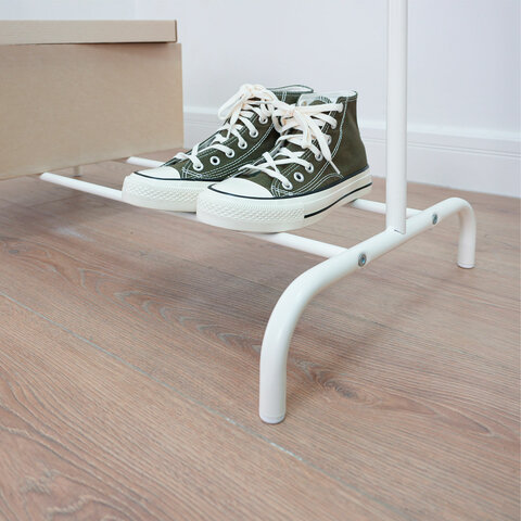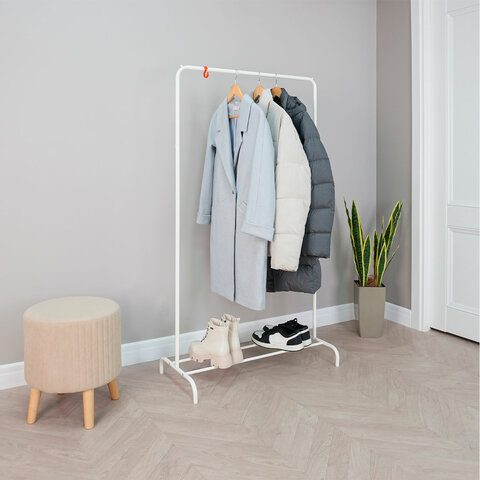 Многофункциональная вешалка для открытого хранения вещей дома, в офисе и зале магазина. Это не просто вешалка, это гардеробная система со штангой для плечиков, полкой для обуви и органайзеров, крючками для сумок, зонтов и других аксессуаров. |