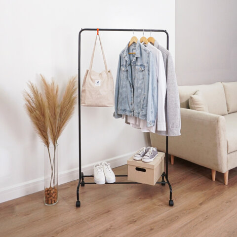 Многофункциональная мобильная вешалка для открытого хранения вещей дома, в офисе и зале магазина. Это не просто вешалка, это гардеробная система со штангой для плечиков, полкой для обуви и органайзеров, крючками для сумок, зонтов и других аксессуаров.