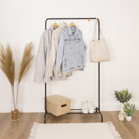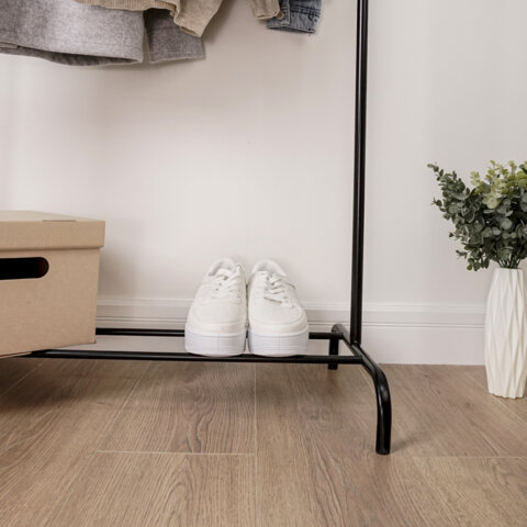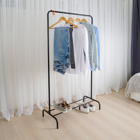 Многофункциональная вешалка для открытого хранения вещей дома, в офисе и зале магазина. Это не просто вешалка, это гардеробная система со штангой для плечиков, полкой для обуви и органайзеров, крючками для сумок, зонтов и других аксессуаров.