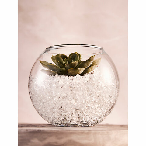 Круглая ваза из прозрачного стекла подойдет для любого интерьера. Также ее можно использовать как заготовку для декорирования и создавать неповторимое произведение, которое подчеркнет тот или иной дизайн помещения. |